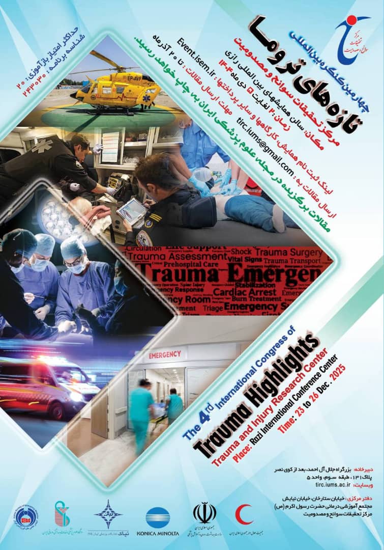به گزارش روابط عمومی دانشگاه علوم پزشکی ایران، چهارمین کنگره بین‌المللی تازه‌های تروما توسط مرکز تحقیقات سوانح و مصدومیت دانشگاه علوم پزشکی ایران و با همکاری انجمن علمی طب اورژانس ایران، از ۲ تا ۵ دی‌ماه ۱۴۰۴ در مرکز همایش‌های رازی برگزار می‌شود.