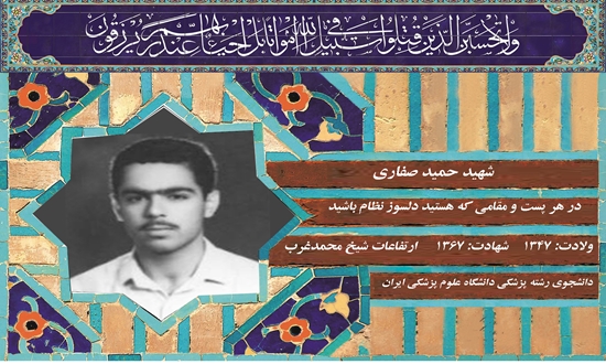 بسم رب الشهداء والصدیقین» شهید حمید صفاری در سال 1347 در خانوادهای زحمتکش و محب اهل بیت عصمت و طهارت(ع) در تهران دیده به جهان گشود. دوره ابتدایی را در حالی که کودکی منضبط و باهوش بود در سال53 آغاز نمود و در این دوران با راهنمایی والدین علاقه خود را نسبت به انجام فرایض دینی با حضور در مساجد و هیأت نشان داد. در سن یازده سالگی شاهد پیروزی انقلاب اسلامی بود که در این ایام به مسائل انقلاب حساستر و به وظیفه خویش آگاهتر گشت. دوره راهنمایی را از سال58 آغاز و در سال61 با موفقیت به پایان رسانید. در این حین برادر وی به دست منافقین به شهادت رسید. این حادثه تأثیر عمیقی در وجود او گذاشت و باعث شد تا او فعالیتهای مذهبی و انقلابی خویش را گسترش دهد. وی بنا به وصیت برادر شهیدش اقدام به تشکیل هیأتی از نوجوانان بنام هیات نوجوانان حزبالله نمود و در طی جلسات آن به آموزش قرآن و ذکر نکات اخلاقی و اظهار ارادات به ائمه گرامی همت گمارد. او در طول عمرخویش نسبت به خودسازی و تزکیه نفس اهمیت خاصی قائل بود و با الگو قرار دادن ائمه اطهار(ع) موفق به کسب فضایل اخلاقی گشت. همچنین در بسیج مسجد نیز عضویت داشته و شبها به پاسداری از دستاوردهای انقلاب اسلامی میپرداخت. در دوره متوسطه یکی از اعضای فعال انجمن اسلامی دبیرستان بود. پس از اخذ دیپلم در سال 65 در رشته پزشکی دانشگاه علوم پزشکی ایران پذیرفته شد. وی در طول جنگ تحمیلی عراق علیه ایران در سه مرحله به جبهه عزیمت نمود و آخرین بار پس از تک ارتش بعث عراق در بهار67 راهی میادین نبرد شد، ولی قبل از آن برای دوستانش نقل کرده بود که:« در خواب دیدم خداوند به من نشان داد که عکس من در کنار عکس برادر شهیدم بود و هم او اظهار میکرد که من تا محرم زنده نمیمانم». سرانجام این سالک طریق الیالله و مصداق کامل مجاهد فی سبیلالله در عید فطر به تاریخ 26/2/6 بر روی ارتفاعات غرب سینهاش که مملو از مهر و محبت به پیامبر اکرم(ص) و اهل بیت گرامی بود مورد اصابت گلوله قرار گرفت و به لقاءالله پیوست. (روحش شاد و یادش جاودانه باد))